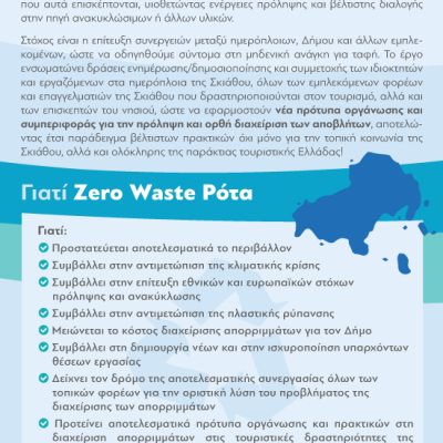 Το έργο Zero Waste Ρότα υλοποιεί ολοκληρωμένες δράσεις μείωσης των αποβλήτων που παράγονται στα τουριστικά ημερόπλοια της Σκιάθου και στις παραλίες που αυτά επισκέπτονται, υιοθετώντας ενέργειες πρόληψης και βέλτιστης διαλογής στην πηγή ανακυκλώσιμων ή άλλων υλικών.