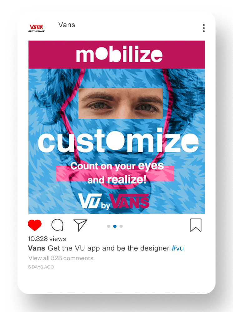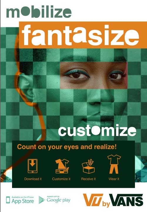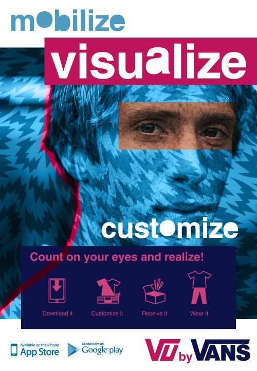The concept is built around a primary wordplay – a rhyme between words that express creativity and action with the suffix -ize and the actual word eye in plural, that is ‘eyes’. Eyes symbolize the vision and every visual process, and more than that visual expression. This connection is supported in the second tagline ‘count on your eyes and realize’ where visual expression and creativity lead to actual realization of the garments. The word mobilize is another wordplay: taking action with the use of the mobile phone; a reference to the actual downloadable application for the mobile device. While ‘mobilize and customize’ are common in all visuals, the central tagline differs in every execution; is the one that conveys inspiration.