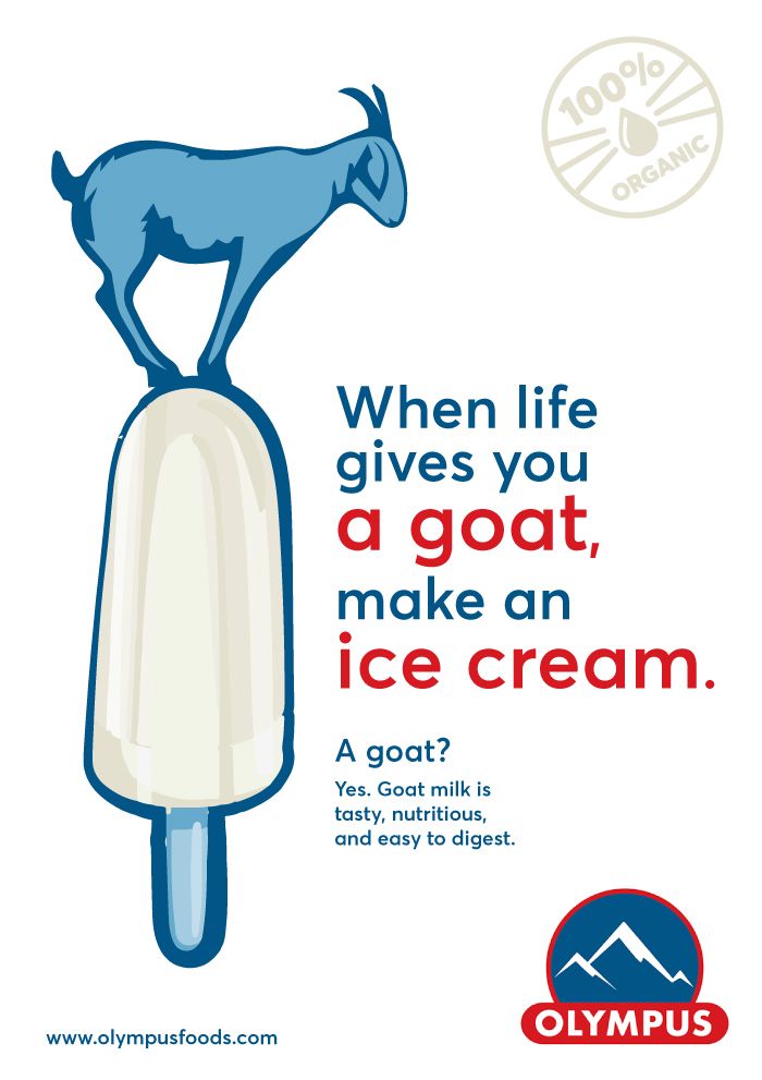 The concept is based on the old American proverbial phrase ‘When life gives you lemons, make lemonade’ which conveys optimism towards different situations in life. Something that wouldn’t necessarily sound good in the beginning, seems to be a great opportunity in the end. In our case, ice cream made of goat milk may seem strange or not suitable in the first place, but we are here to provide evidence that the product will surprise the consumers positively as it turns out to be healthier and tastier than ice creams made of cow milk. More than that it is an organic product, which enhances the healthy identity of the new ice cream.